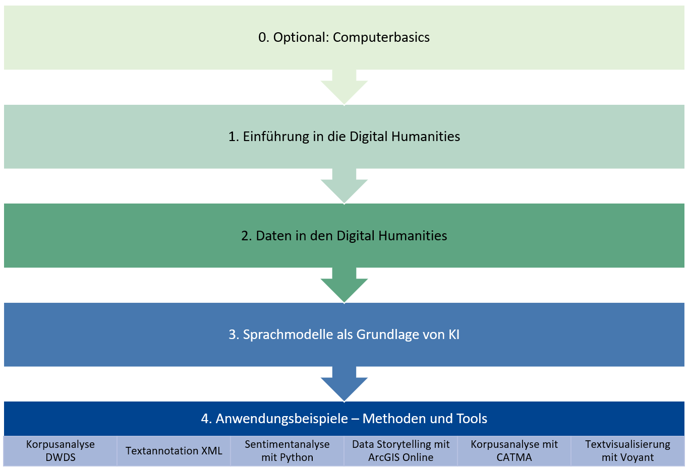 Für die Entwicklung des Kurses waren mehrere Voraussetzungen entscheidend. Auf institutioneller Ebene brauchte es eine etablierte Infrastruktur: Die Verankerung im Ergänzungsbereich setzt voraus, dass entsprechende Strukturen und Prozesse für die Kursanmeldung und Leistungsverbuchung an der Hochschule bereits existieren. Inhaltlich war ein ausgewiesenes Netzwerk aus Fachexpert:innen unerlässlich. Die thematische Breite der DH erfordert verschiedene Perspektiven, daher sind Kooperationen innerhalb der Hochschule sowie die Nachnutzung vorhandener Open Educational Resources, insbesondere der Plattform forTEXT, eine Grundbedingung. Für das ko-kreative Begleitseminar waren hochschuldidaktische Kenntnisse im Projektteam sowie Kapazitäten für die Begleitung und Auswertung des studentischen Feedbacks erforderlich. Zudem mussten Studierende bereit sein, sich nicht nur als Lernende, sondern aktiv als Mitgestalter:innen einzubringen, was eine offene, vertrauensvolle Seminarkultur voraussetzte.